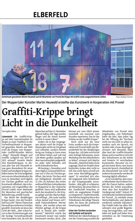 Während der Ideenfindung sowie der Umsetzung wurden die Mitarbeiter von proviel stets eingebunden. „Ein Teilnehmer hatte die Idee, dass jeden Tag bei der Öffnung des Türchens nicht nur ein Licht zu sehen ist, sondern auch ein Spruch, ein Symbol oder etwas derartiges“, erinnert sich Heuwold. Diese Idee fand der Graffiti-Künstler klasse und so machte er sich mit den Teilnehmern an die Arbeit und kreierte 24 verschiedene Kunstwerke. Darunter ein Engel mit einem Stern, eine Sonne sowie der Spruch „Dunkelheit ist die Abwesenheit von Licht“. Die anderen Kunstwerke werden ab Sonntag täglich offenbart.