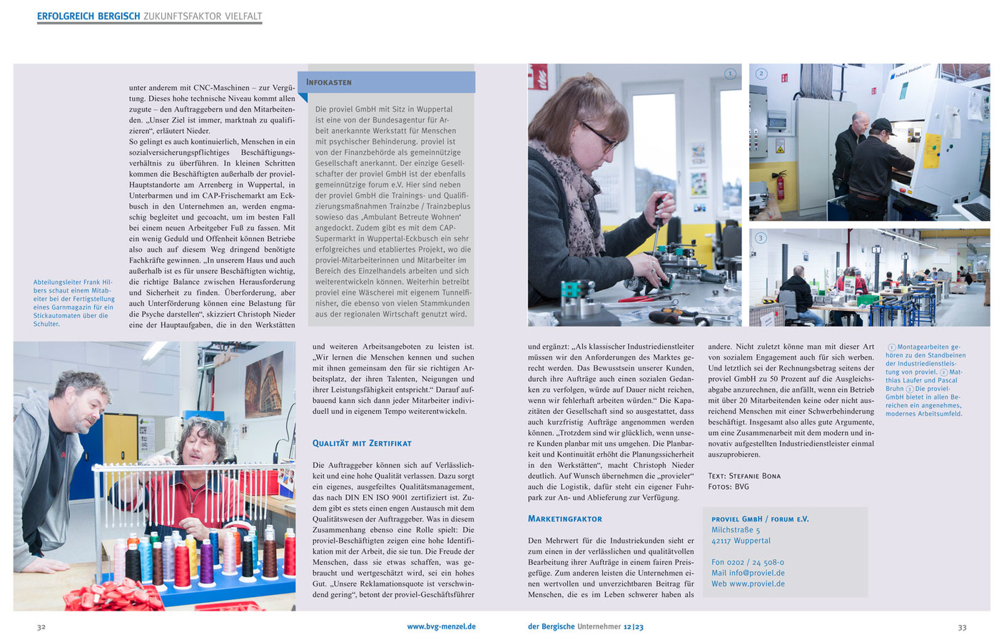 Rund 1.000 Menschen finden unter dem Dach der GmbH und des Vereins berufliche Teilhabe, Struktur im Alltag und neue Lebensqualität. Davon sind ca. 750 Personen in der Werkstatt tätig, rund 250 Beschäftigte nehmen an den „Train2Be“-Maßnahmen im Auftrag des Jobcenters und der Stadt Wuppertal teil. Als Menschen mit einer psychischen Erkrankung oder Behinderung finden sie bei proviel & forum einen geschützten Raum und Rahmen, um einer sinnstiftenden und wertschöpfenden Tätigkeit nachzugehen, die ihnen neue Lebensfreude und Zuversicht in die eigenen Fähigkeiten vermittelt. „Bei unseren Mitarbeiterinnen und Mitarbeitern finden Sie alle erdenklichen Professionen und Berufsausbildungen. Von der ungelernten Kraft über den Handwerker bis zum Akademiker ist alles dabei. Eine psychische Krankheit kann eben jeden treffen“, erzählt der Geschäftsführer. Angeleitet und motiviert werden die „provieler“ von einem fachlich und pädagogisch hoch kompetenten Team. 120 Fachkräfte für Arbeit- und Berufsförderung und ein starkes Team von Sozialdienst, Rehaplanung, Jobcoaches und Mitarbeiterentwicklung begleiten die Mitarbeiterinnen und Mitarbeiter in der täglichen Arbeit, so dass diese auch bei Engpässen ohne Druck und Stress gelingt.