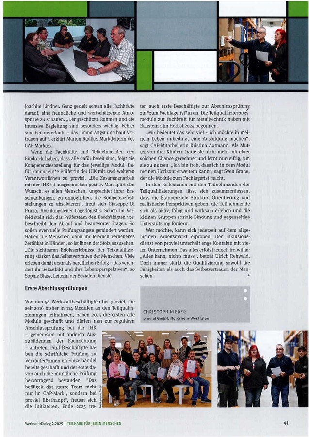 Von den 58 Werkstattmitarbeitenden bei proviel, die seit 2016 bisher in 114 Modulen an den Teilqualifizierungen teilnahmen, haben 2025 die ersten alle Module geschafft und dürfen nun zur regulären Abschlussprüfung bei der IHK - gemeinsam mit anderen Azubis der Fachrichtung - antreten. Fünf Beschäftigte haben die schriftliche Prüfung zu Verkäufer*innen im Einzelhandel bereits geschafft und der erste davon auch die mündliche Prüfung hervorragend bestanden. (Anmerkung nach Redaktionsschluss: alle 5 haben erfolgreich bestanden!) "Das beflügelt das ganze Team nicht nur im CAP-Markt, sondern bei proviel überhaupt", freuen sich die Initiatoren. Ende des Jahres treten auch erste provieler zur Abschlussprüfung zum Fachlagerist/-in an. Die Teilqualifizierungsmodule zur Fachkraft für Metalltechnik haben mit Baustein 1 im vergangenen Herbst begonnen.