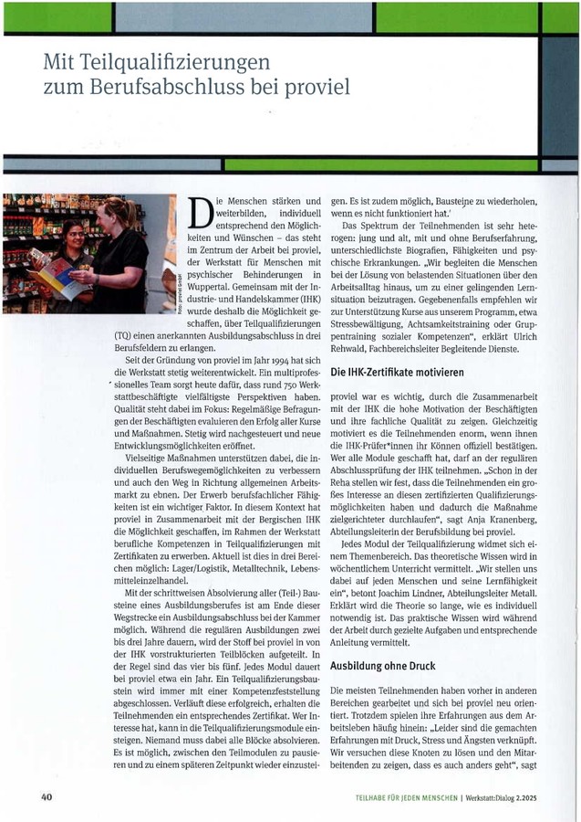 Die Menschen stärken und weiterbilden, individuell entsprechend den Möglichkeiten und Wünschen - das steht im Zentrum der Arbeit bei proviel, der Werkstatt für Menschen mit psychischer Behinderung in Wuppertal. Gemeinsam mit der IHK wurde deshalb bis jetzt in drei Berufsfeldern die Möglichkeit geschaffen, über Teilqualifizierungen (TQ) einen anerkannten Ausbildungsabschluss zu erlangen.
