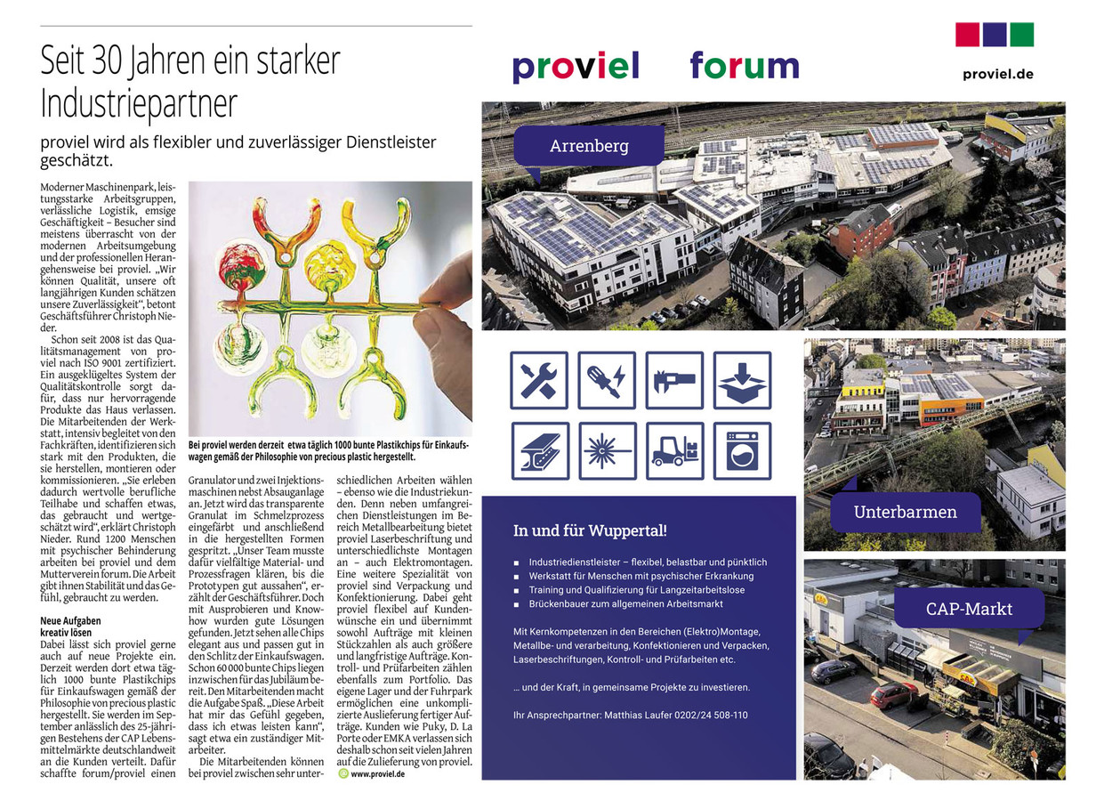 Moderner Maschinenpark, leistungsstarke Arbeitsgruppen, verlässliche Logistik, emsige Geschäftigkeit – Besucher sind meistens überrascht von der modernen Arbeitsumgebung und der professionellen Herangehensweise bei proviel. „Wir können Qualität, unsere oft langjährigen Kunden schätzen unsere Zuverlässigkeit“, betont Geschäftsführer Christoph Nieder. Schon seit 2008 ist das Qualitätsmanagement von proviel nach ISO 9001 zertifiziert. Ein ausgeklügeltes System der Qualitätskontrolle sorgt dafür, dass nur hervorragende Produkte das Haus verlassen. Die Mitarbeitenden der Werkstatt, intensiv begleitet von den Fachkräften, identifizieren sich stark mit den Produkten, die sie herstellen, montieren oder kommissionieren. „Sie erleben dadurch wertvolle berufliche Teilhabe und schaffen etwas, das gebraucht und wertgeschätzt wird“, erklärt Christoph Nieder. Rund 1200 Menschen mit psychischer Behinderung arbeiten bei proviel und dem Mutterverein forum. Die Arbeit gibt ihnen Stabilität und das Gefühl, gebraucht zu werden.