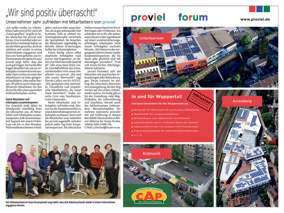 proviel kümmert sich um Menschen mit psychischen Erkrankungen oder Behinderungen. forum trainiert im Auftrag des Jobcenters Menschen im Leistungsbezug, die den Weg zurück zum ersten Arbeitsmarkt suchen. Für beide gibt es bei der Einstellung viele Möglichkeiten für Unterstützung und Zuschüsse. Derzeit sucht das Inklusionsteam insbesondere Büroarbeitsplätze für mehrere motivierte provieler mit viel Erfahrung in diesem Berufsfeld. Interessenten erfahren Näheres bei Yesim Fischer, Telefon 0202/24508-376, Email y.fischer@forum-ev.eu.