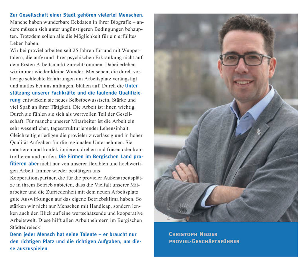 Wir bei proviel arbeiten seit nunmehr fast 25 Jahren für und mit Wuppertalern, die aufgrund ihrer psychischen Erkrankung nicht auf dem Ersten Arbeitsmarkt zurechtkommen. Dabei erleben wir immer wieder kleine Wunder. Menschen, die durch vorherige schlechte Erfahrungen am Arbeitsplatz verängstigt und mutlos bei uns anfangen, blühen auf. Durch die Unterstützung unserer Fachkräfte und die laufende Qualifizierung entwickeln sie neues Selbstbewusstsein, Stärke und viel Spaß an ihrer Tätigkeit. Die Arbeit ist ihnen wichtig. Durch sie fühlen sie sich als wertvollen Teil der Gesellschaft. Für manche unserer Mitarbeiter ist die Arbeit ein sehr wesentlicher, tagesstrukturierender Lebensinhalt.