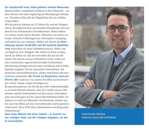 Gleichzeitig erledigen die provieler zuverlässig und in hoher Qualität Aufgaben für die regionalen Unternehmen. Sie montieren und konfektionieren, drehen und fräsen oder kontrollieren und prüfen. Die Firmen im Bergischen Land profitieren aber nicht nur von unserer flexiblen und hochwertigen Arbeit. Immer wieder bestätigen uns Kooperationspartner, die für die provieler Außenarbeitsplätze in ihrem Betrieb anbieten, dass die Vielfalt unserer Mitarbeiter und die Zufriedenheit mit dem neuen Arbeitsplatz gute Auswirkungen auf das eigene Betriebsklima haben. So stärken wir nicht nur Menschen mit Handicap, sondern lenken auch den Blick auf eine wertschätzende und kooperative Arbeitswelt. Diese hilft allen Arbeitnehmern im Bergischen Städtedreieck! Denn jeder Mensch hat seine Talente – er braucht nur den richtigen Platz und die richtigen Aufgaben, um diese auszuspielen.