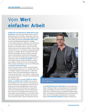 Es gibt Lebenssituationen, in denen eine gleichförmige Arbeit passender sein kann als von „schneller, höher, weiter“ geprägte Aufgaben. Darauf müssen wir Rücksicht nehmen. Denn eine Gesellschaft bleibt nur lebenswert, wenn dort alle ihren Platz – ihre Teilhabe - finden. Starke und schwache Menschen, Visionäre und Zurückblickende, alte und junge Leute.