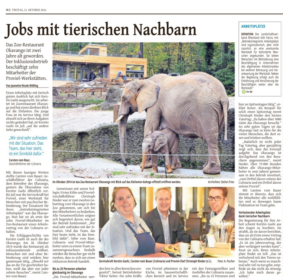 Sehr gerne haben wir am 20.10.2016 im Okavango im Grünen Zoo Wuppertal auf 2 erfolgreiche Betriebsjahre seitens Culinaria & proviel gemeinsam angestoßen und 2 Jahre aktiv gelebte Inklusion auf dem Arbeitsmarkt gewürdigt. Carsten vom Bauer, Geschäftsführer der Culinaria GmbH, und Christoph Nieder, Geschäftsführer der proviel GmbH haben den 2-jährigen Geburtstag mit Freude genutzt, um den anwesenden Mitarbeiterinnen und Mitarbeitern zu danken und auf das Geleistete stolz zurück zu schauen.