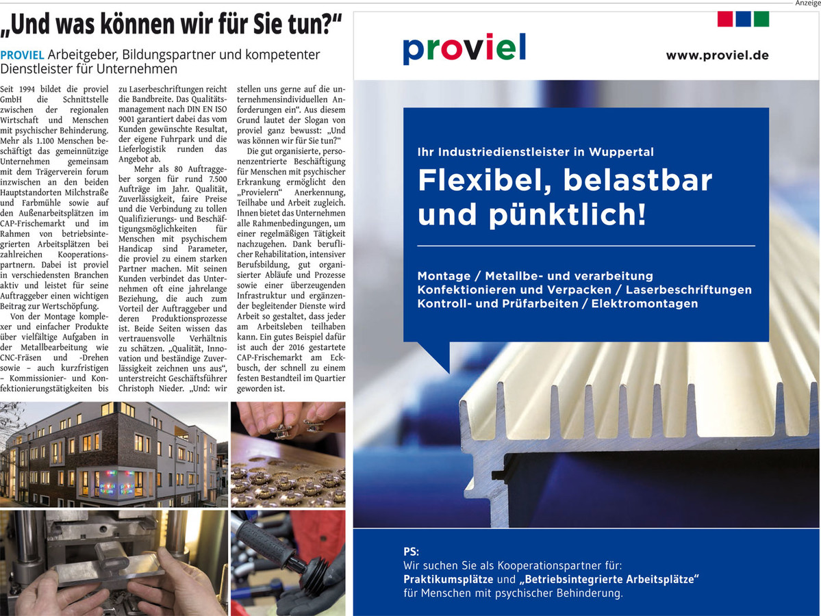 Mehr als 80 Auftraggeber sorgen für rund 7.500 Aufträge im Jahr. Qualität, Zuverlässigkeit, faire Preise und die Verbindung zu tollen Qualifizierungs- und Beschäftigungsmöglichkeiten für Menschen mit psychischem Handicap sind Parameter, die proviel zu einem starken Partner machen. Mit seinen Kunden verbindet das Unternehmen oft eine jahrelange Beziehung, die auch zum Vorteil der Auftraggeber und deren Produktionsprozesse ist. Beide Seiten wissen das vertrauensvolle Verhältnis zu schätzen. „Qualität, Innovation und beständige Zuverlässigkeit zeichnen uns aus“, unterstreicht Geschäftsführer Christoph Nieder. „Und: wir stellen uns gerne auf die unternehmensindividuellen Anforderungen ein“. Aus diesem Grund lautet der Slogan von proviel ganz bewusst: „Und was können wir für Sie tun?“