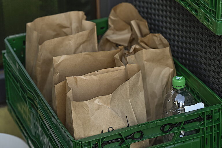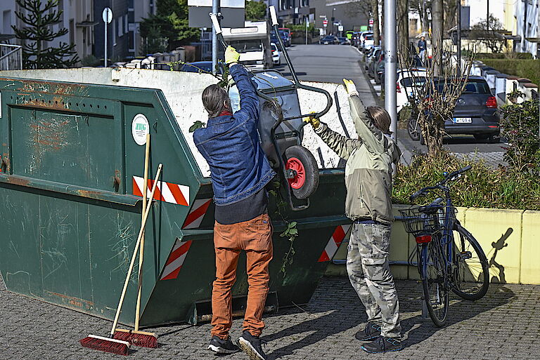 „Es ist schön, hier im Team zu arbeiten“, findet Bianca Stegmaier, und schleppt einen weiteren Sack voller Grünzeug zum Müllcontainer. Zwei Vormittage lang haben 13 provieler und zwei Fachkräfte bei einer proviel mobil-Aktion die Grünanlagen rund um das Gartenhallenbad Langerfeld gepflegt. Der Erfolg der Aktion ist deutlich sichtbar: Jetzt wirken die Beete wieder ordentlich, das Team hat Papierschnipsel und Verpackungsfolien entfernt und jede Menge Brombeer-Ranken abgeschnitten. Der große Container vor dem Bad ist bis oben hin voller Grünschnitt. Um im Team herrscht hervorragende Laune. Muntere Sprüche fliegen hin und her, alle sind stolz auf das, was sie geschafft haben.