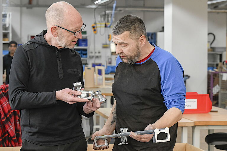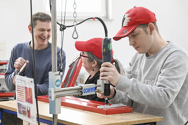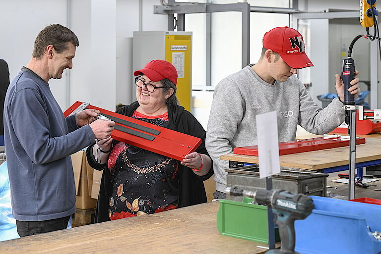 Die Arbeitsplätze zur laufenden Qualifizierung der Teilnehmer*innen für die Montage der HOLTMANN-Produkte befinden sich im Bereich der Beruflichen Bildung. Dort geht es darum, psychisch erkrankte Menschen im Rahmen einer beruflichen Reha wieder an Arbeit und einen strukturierten Tagesablauf heranzuführen. „An diesen Arbeitsplätzen kann Teamarbeit gut trainiert werden: Hier können die Teilnehmer*innen auch lernen, zu akzeptieren, dass andere in einer anderen Geschwindigkeit arbeiten“, erklärt Anja Kranenberg, Abteilungsleiterin der Beruflichen Bildung. Gleichzeitig üben die Teilnehmer*innen unter anderem Pünktlichkeit, Abmeldung im Krankheitsfall und wertschätzenden Umgang miteinander.