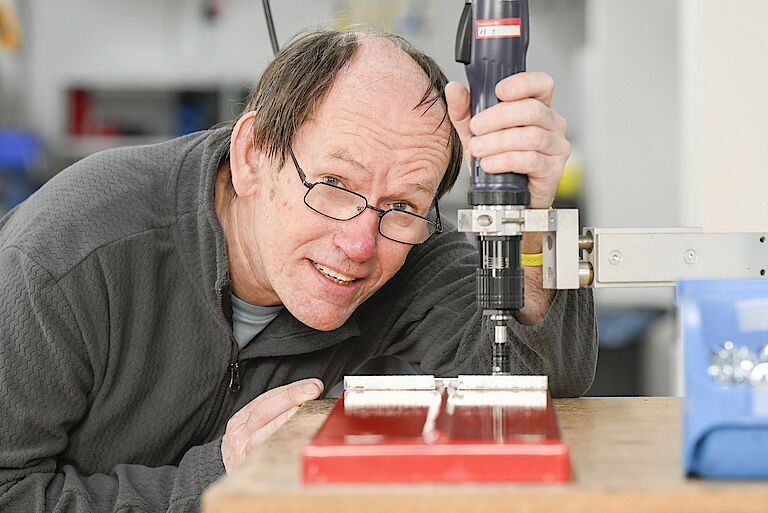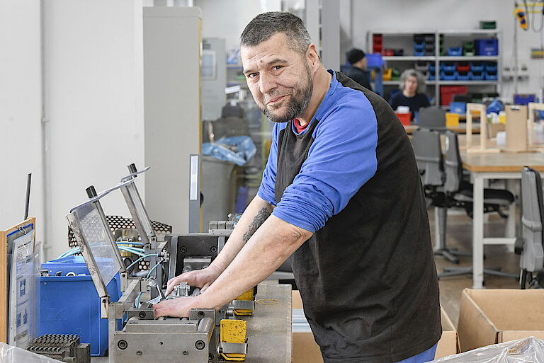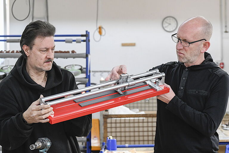 „Wir lassen viel lieber hier in Deutschland fertigen als in China“, sagt Stefan Strube, Verkaufsleiter der HOLTMANN GmbH. Zufrieden sieht er zu, wie ein Mitarbeiter von proviel das Gestänge des Fliesenschneiders auf die Bodenplatte schraubt. Schon seit 2008 montiert proviel die Fliesenschneidmaschinen für JOKOSIT, seit 2013 dann für HOLTMANN. Rund 10.500 dieser Fliesenschneider in verschiedenen Größen verlassen pro Jahr die Hallen der Werkstatt für Menschen mit psychischen Behinderungen.