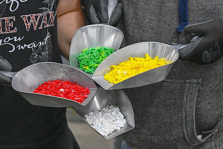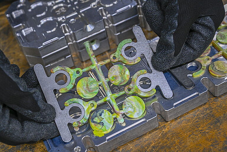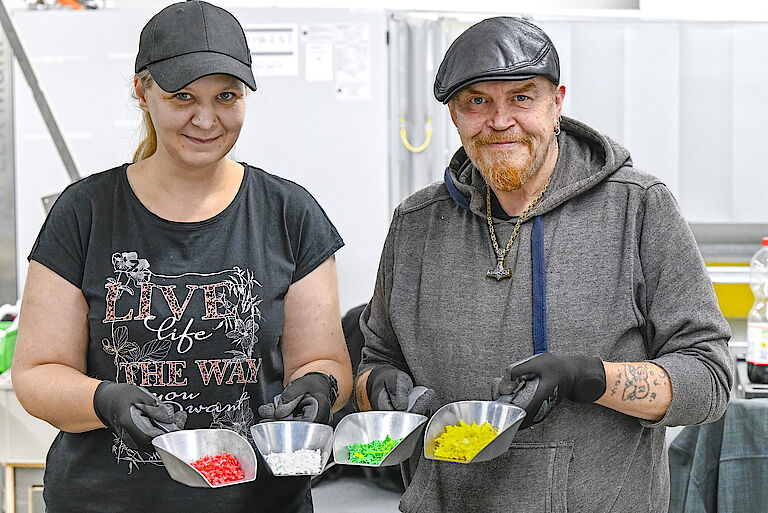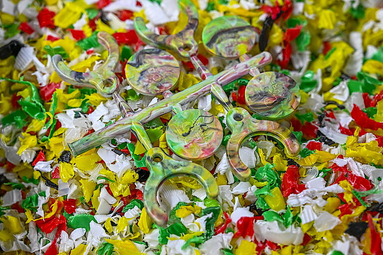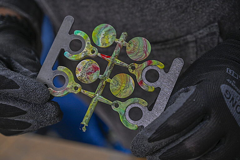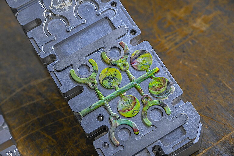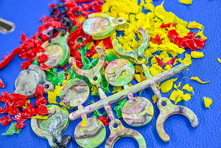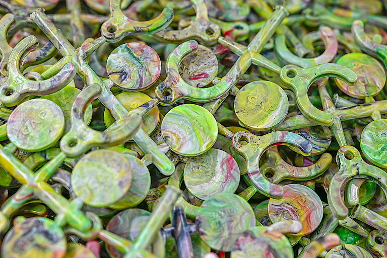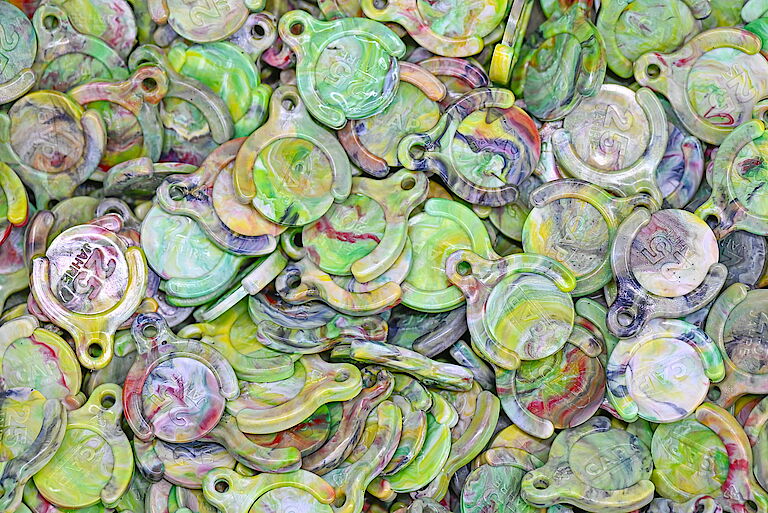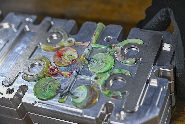 Gerade werden unsere Maschinen aufgebaut und eingestellt. Erste „Probeschüsse“ sind vielversprechend erfolgt. Erster Auftrag: Einkaufswagenchips aus Altplastik zum 25 Jubiläum der CAP Lebensmittelmärkte im Herbst 2024.