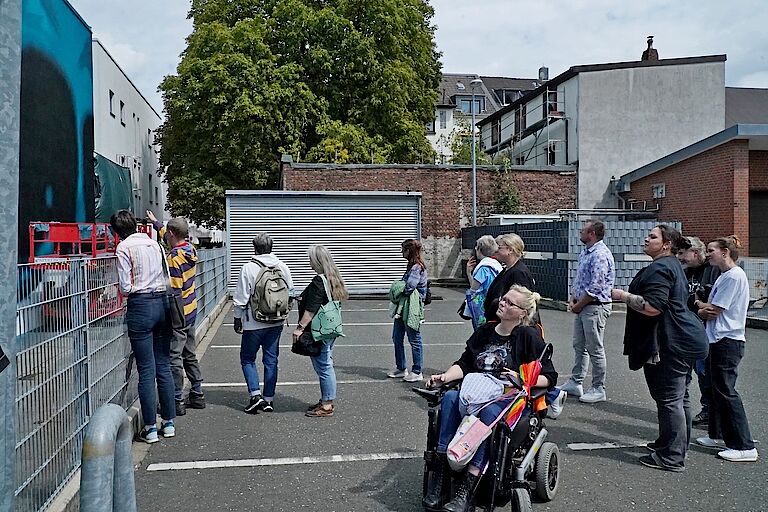 „Das ist wirklich mega!“ sind sich alle einig. Kunstinteressierte von proviel haben sich getroffen, um gemeinsam den Schaffensprozess des Graffiti-Künstlers Insane51 zu betrachten und über das Kunstwerk zu sprechen, das an der Fassade des Standorts Farbmühle gerade entsteht. Alle sind in verschiedenen Kursen von proviel selbst künstlerisch aktiv und wissen die Arbeit entsprechend zu schätzen.