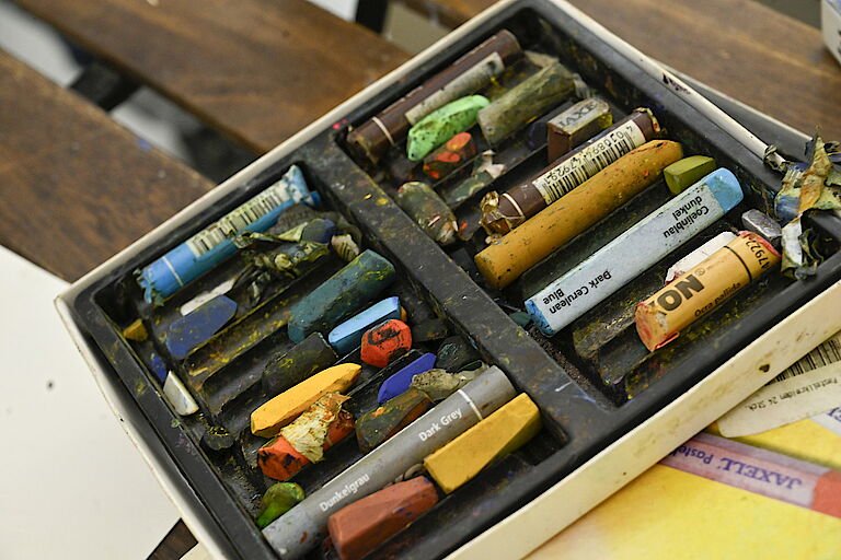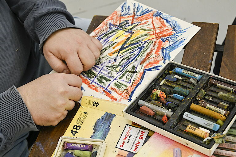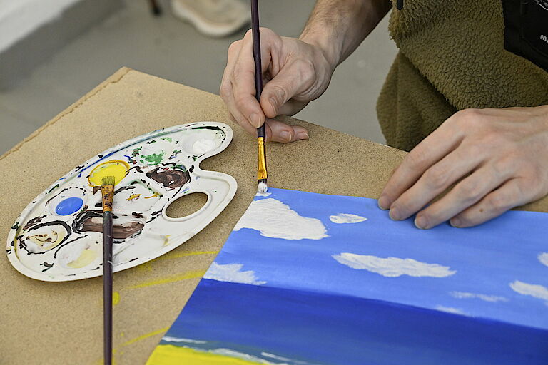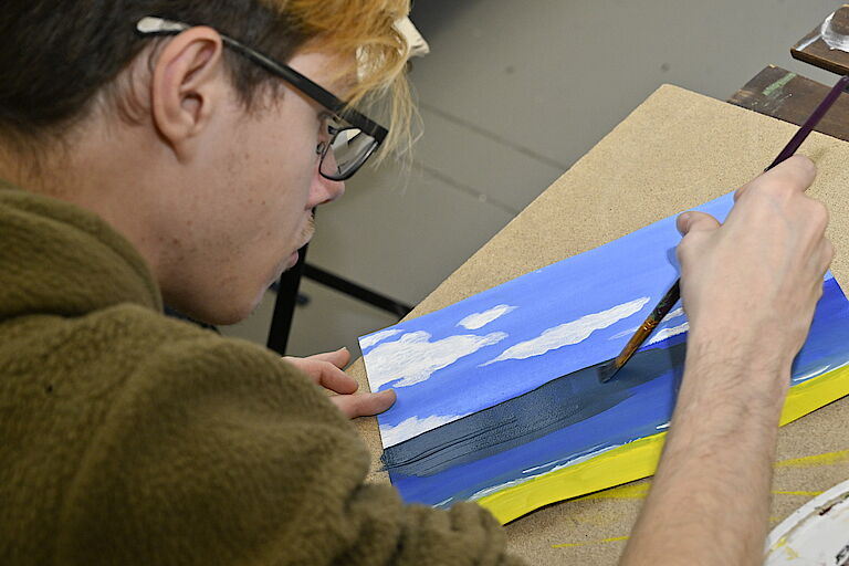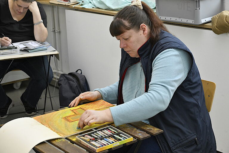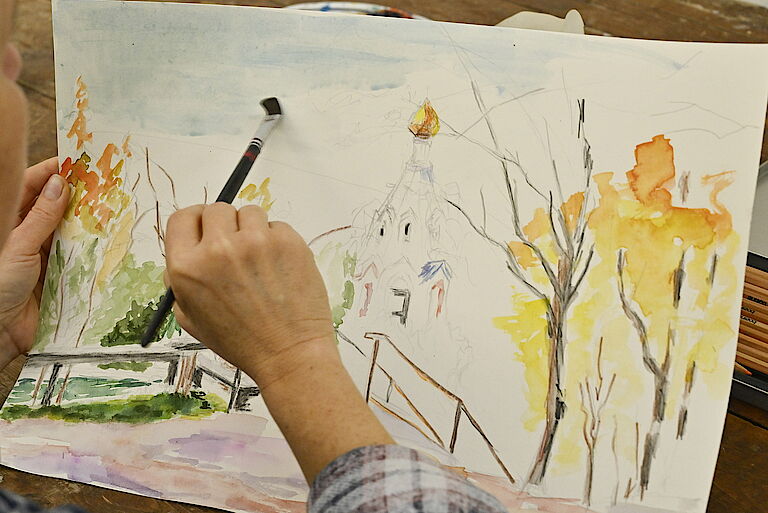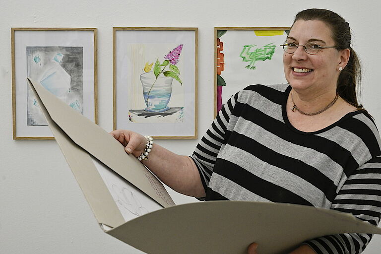 Anna malt mit Aquarellfarben surrealistisch anmutende Landschaften mit Wasser und Bäumen. „Für mich ist es wichtig, dass ich mich beim Malen beruhige“, sagt sie. „Vieles kann ich nicht mit Worten erklären – aber mit Bildern.“ Ganz anders hingegen die sehr detailgetreuen realistischen Küchenutensilien von Stephanie Wauer, die diese für ein Kochbuch malt.