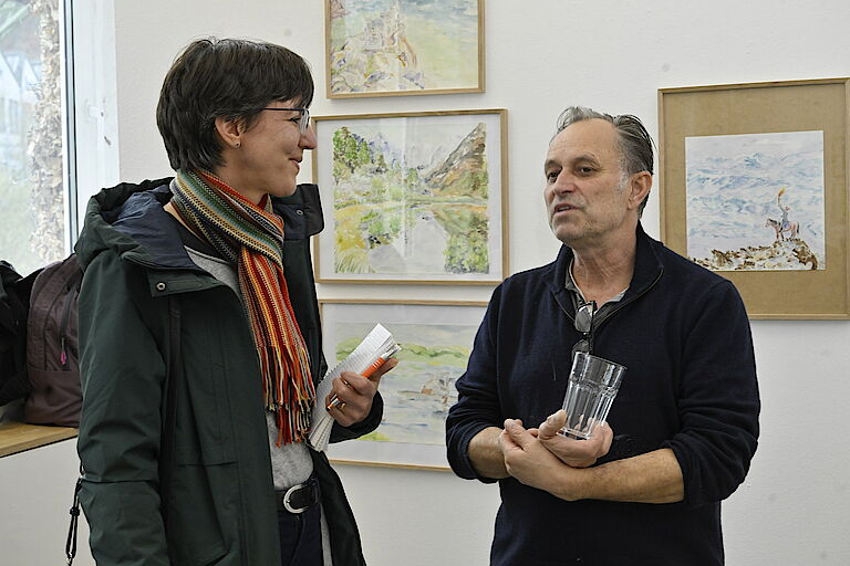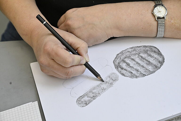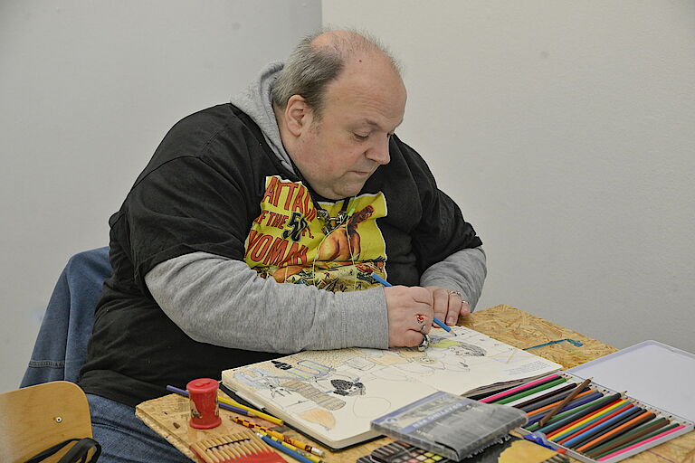 Anja Friedrichs schätzt besondere Stifte, die eine breite und schmale Kante haben: „Da kann man wunderbar schnell etwas erreichen, das macht Spaß.“ In ihren Werken schmelzen Eiswürfel dahin oder eine Kaffeetasse erinnert an gemütliche Kaffeestunden. Auch Paul Münzer ist stolz auf das Feedback der Ausstellungseröffnung: „Vielen haben meine Bilder gefallen – das motiviert mich. Es war schon mein Kindheitstraum, Künstler zu werden.“