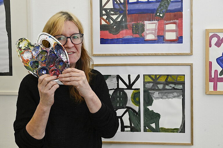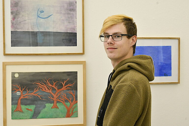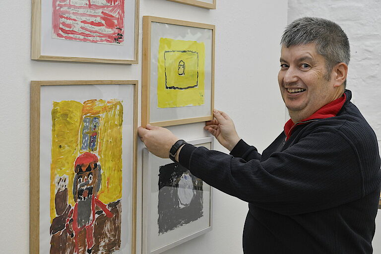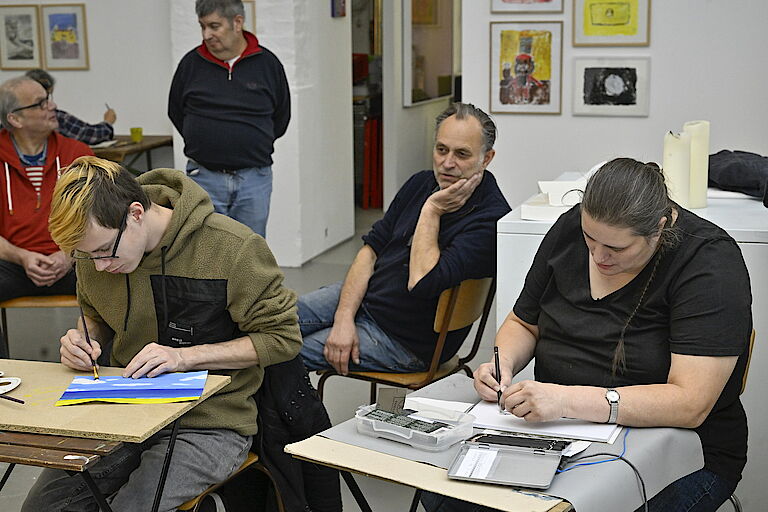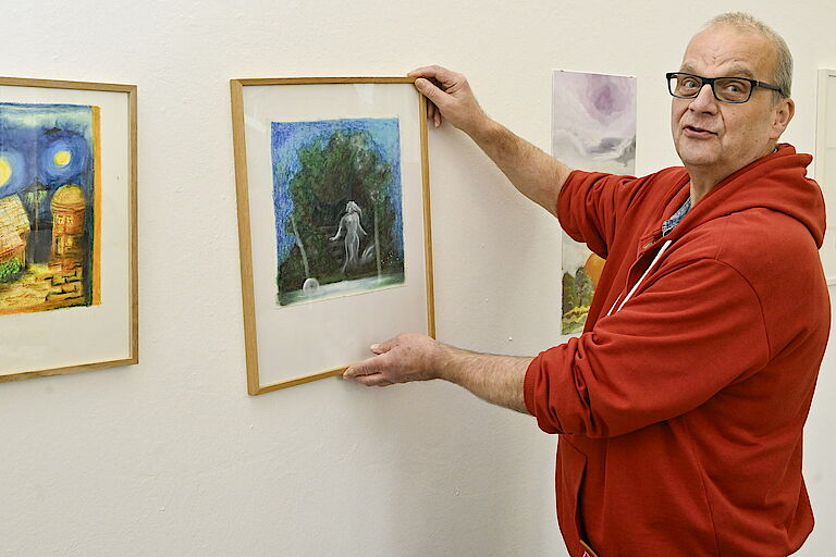 „Es ist Wahnsinn, was für Werke die Menschen von proviel hier in der Gruppe machen. Da steckt so viel Ausdruckskraft dahinter“, bewundert Jürgen Grölle seine Leute, denen er im Kurs immer wieder kleine Tipps gibt oder Tricks verrät. Vielen sei es schwer gefallen, fünf Werke für die Ausstellung auszusuchen. Jürgen Grölle entschied dann gemeinsam mit Künstlerin Jaana Caspary, wie die Bilder aufgehängt werden.