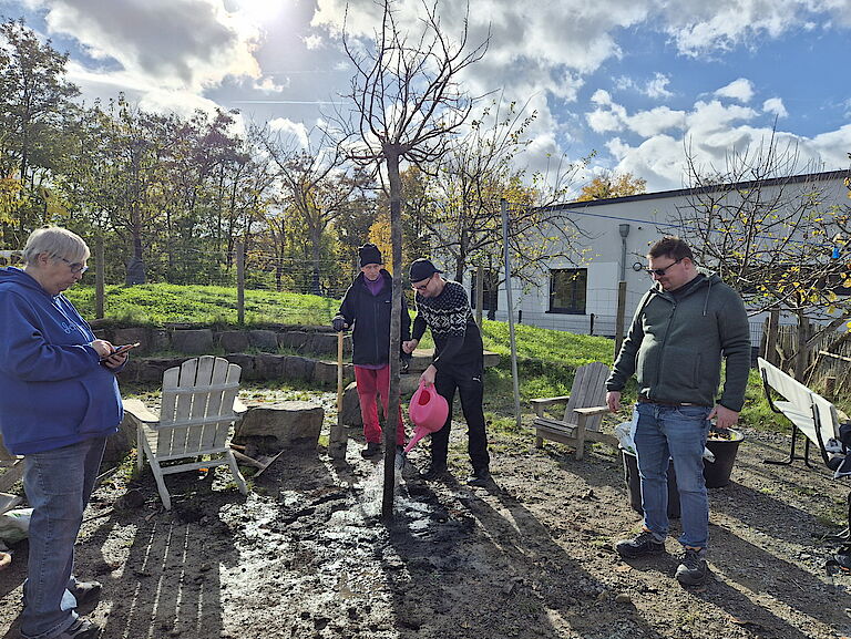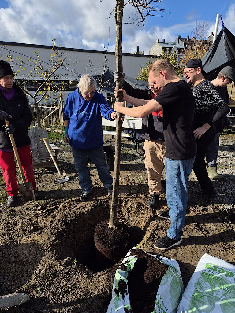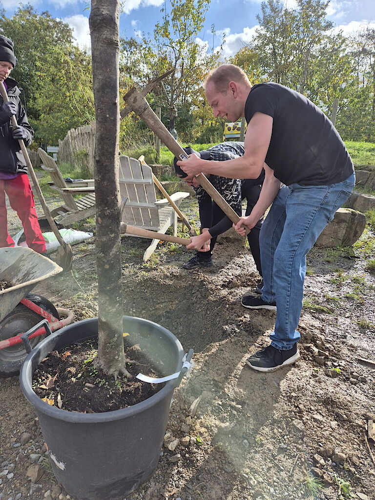 Der dritte und finale Baum konnte nun in dieser Woche von einer engagierten Truppe - mit viel Krafteinsatz bei „schwerem“ Boden - im Nutzgarten der Alten Feuerwache, unmittelbar angrenzend an den Kulturkindergarten, als zukünftiger Schattenspender gepflanzt werden. Eine echt tolle Aktion, die viel Freude gemacht hat.
