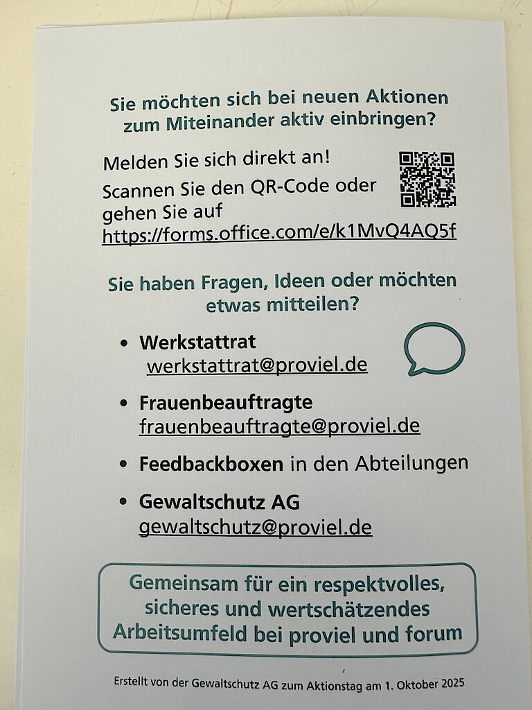 Der Aktionstag setzte ein starkes Zeichen für eine gewaltfreie, wertschätzende Betriebskultur und ein gutes Arbeitsklima. Er war als Auftakt gedacht – das Thema soll künftig in vertiefenden Workshops weiterbearbeitet werden, direkt an den Orten, an denen wir täglich zusammenarbeiten. Die Bereitschaft zur aktiven Mitgestaltung wurde am Aktionstag deutlich gefördert und bleibt weiterhin willkommen.