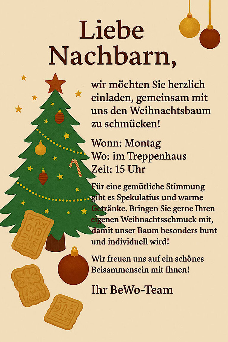 Bereits in den ersten Tagen wurden schöne Aktionen durchgeführt. Gemeinsam wurde bei heißen Getränken und Spekulatius der Weihnachtsbaum geschmückt, was für eine festliche Atmosphäre im Haus sorgt. Außerdem gibt es Einladungen zu gemütlichen Treffen in der BeWo-Küche, bei denen die Mieter die Gelegenheit hatten, bei Tee, Kaffee und Plätzchen miteinander ins Gespräch zu kommen und die Gemeinschaft zu stärken.